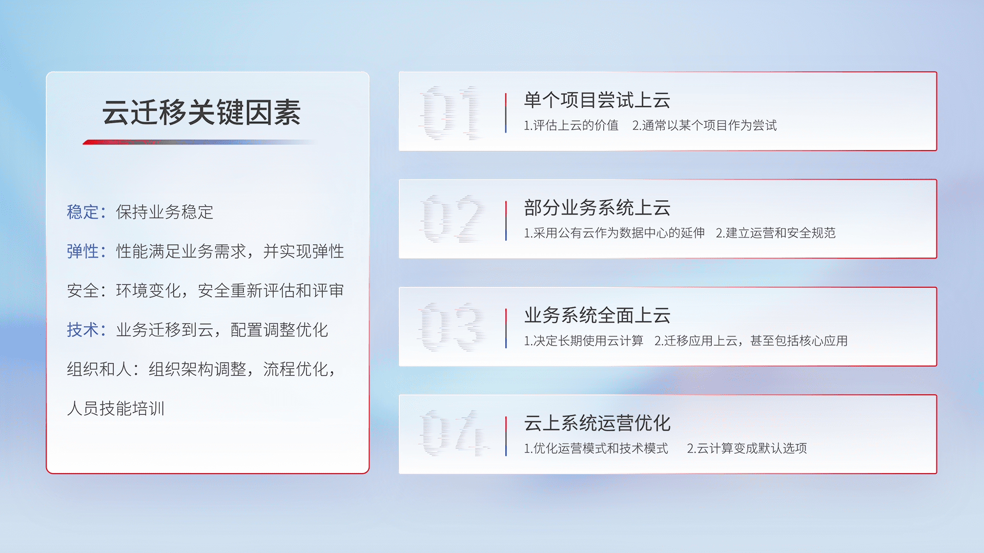 结合实际业务,,,,从规划设计、、云平台选型、、云原生改造、、、、数据迁移、、、、集成交付,,,,迁移全过程为客户识别最佳上云路径,,,,做好风险识别管理,,设计网络架构、、、身份权限、、安全审计合规、、、、操作审计、、、、日志审计、、、、监控告警策略、、多站点容灾设计等,,,,对云上基础设施进行整体规划,,,,提升IT治理水平,,以满足弹性、、、、高可用、、、、高性能的需求。。