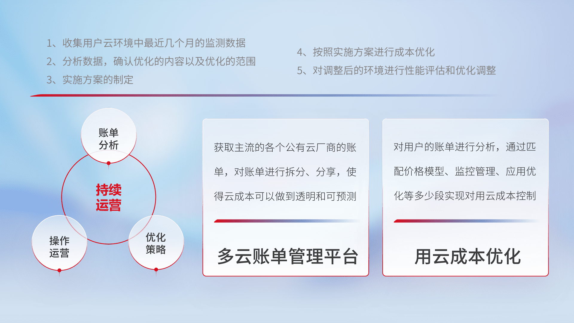通过多云纳管,,,,以统一的资源数据模型把客户的云资源进行抽象和封装,,,,进而实现对多云资源的统一操作,,,,保障云资源管理的可靠性、、稳定性与可用性。。。量身定制化运维内容,,,配置、、、、开发运维、、补丁管理、、备份、、、监控、、、、认证和访问管理、、审计和日常巡检等,,保障在用云过程中的可靠度,,稳定度以及高可用率。。