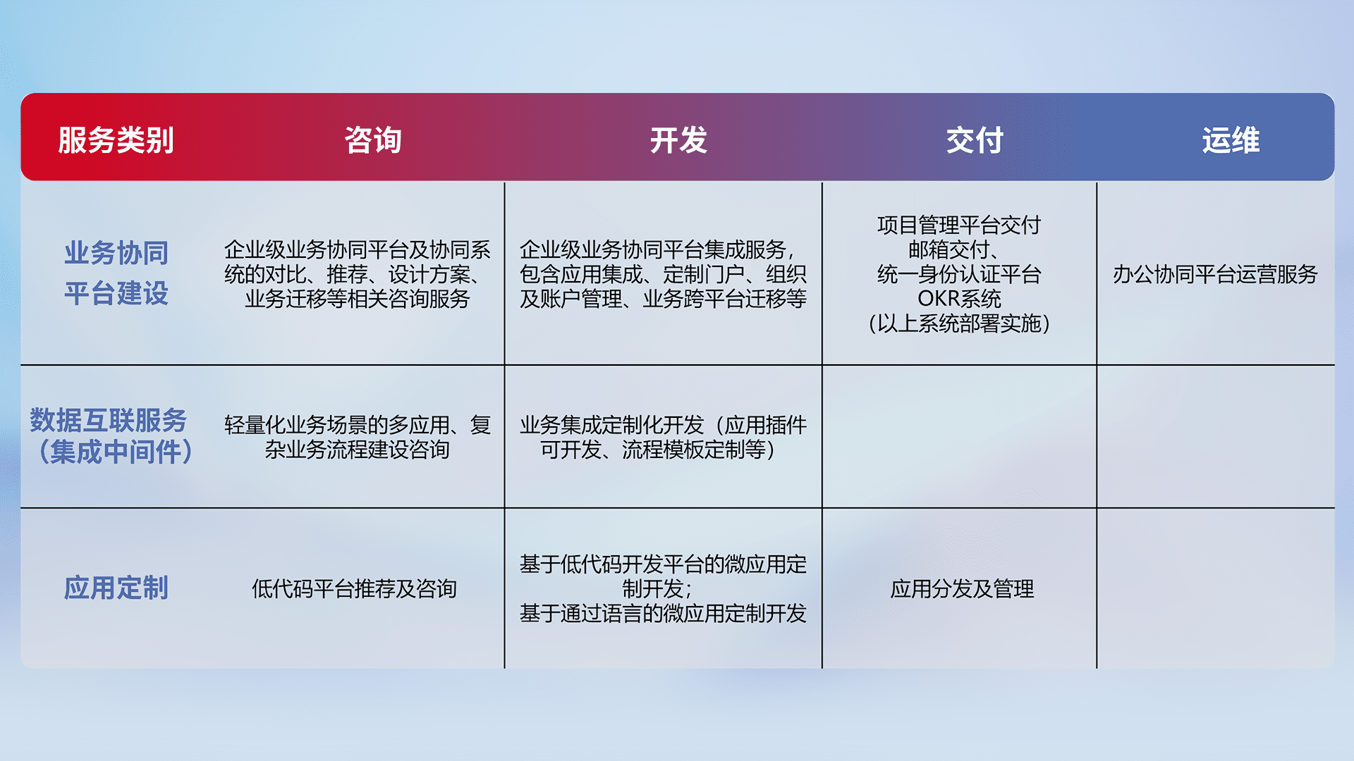 针对钉钉、、企微、、、IDaas等平台级产品提供产品的规划、、、、方案、、、、交付、、、定制化开发等服务,,,实现如统一协同办公、、、、智能客户服务、、、、混合会议管理、、、智能数据查询、、、、等业务场景,,,实现数字化转型。。。